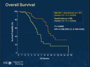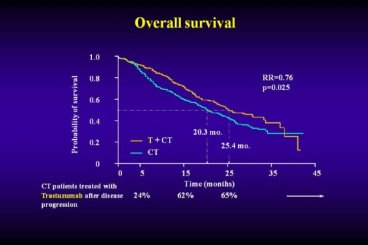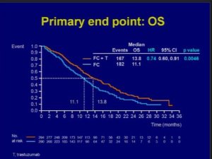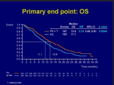 胃がんでは20%程度の患者でHER2が陽性である。ToGA試験でも、3807名の進行胃がん患者をスクリーニングし810人がHER2陽性。検査方法は、IHC3+ またはFISH陽性(2X以上)。乳がんでも大体20%程度で陽性なので同じ程度である。810名のうち、その他の適格条件を満たし同意が得られた患者584名を5FU+シスプラチン対5FU+シスプラチンにハーセプチンを加えた群にランダム化割り付けし、生存期間(Overall Survival:OS)を主たるエンドポイントに検討結果、明らかな差がでた。抗がん剤群の生存期間中央値が、11.3か月であったのに対しハーセプチンを加えた群は、13.8か月(P=0.0046)(図1)。